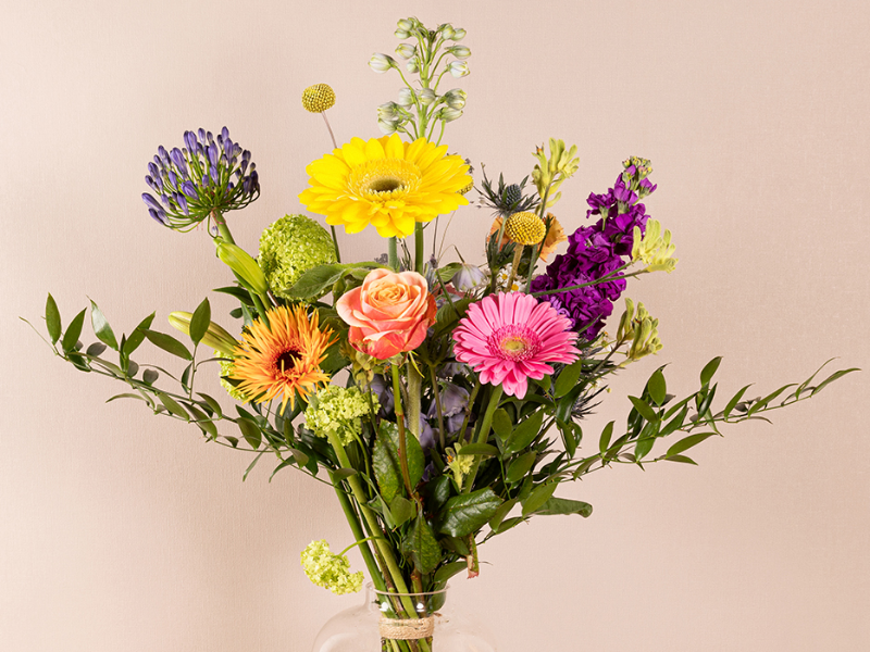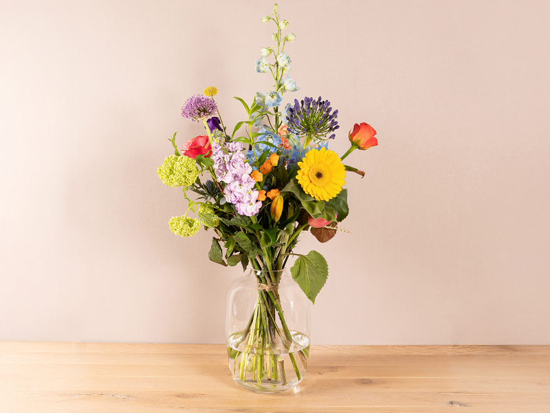 Fris en speels plukboeket met diverse tinten, losjes geschikt met hoogteverschil en open uitstraling.