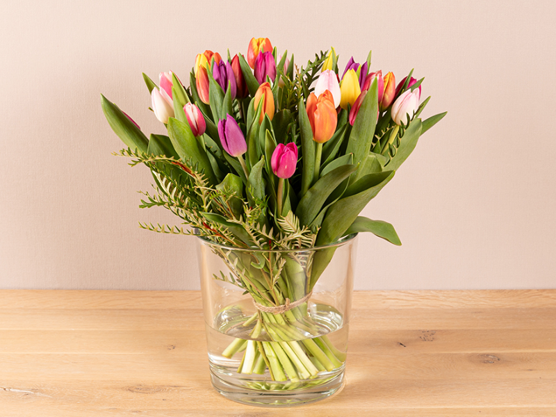 Rond gemengd tulpenboeket aangevuld met wat groen.