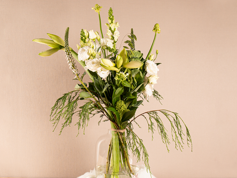 Weelderig winterboeket met bloemen van het seizoen en groene accenten zoals sierlijke conifeer.